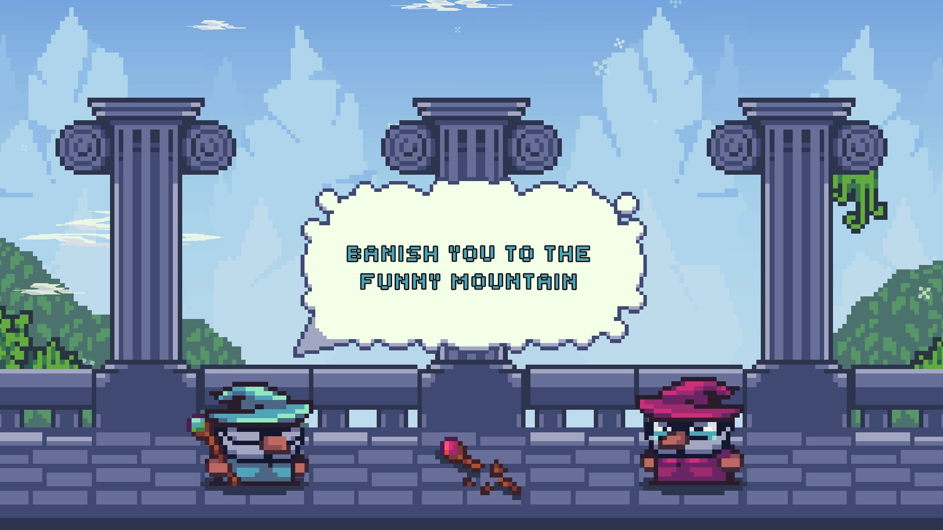 The poor magician was exiled to a FUNNY mountain because he broke his staff. Now he has to go through the trials of the funny mountain in order to prove to his mentor that he is a TRUE magician!